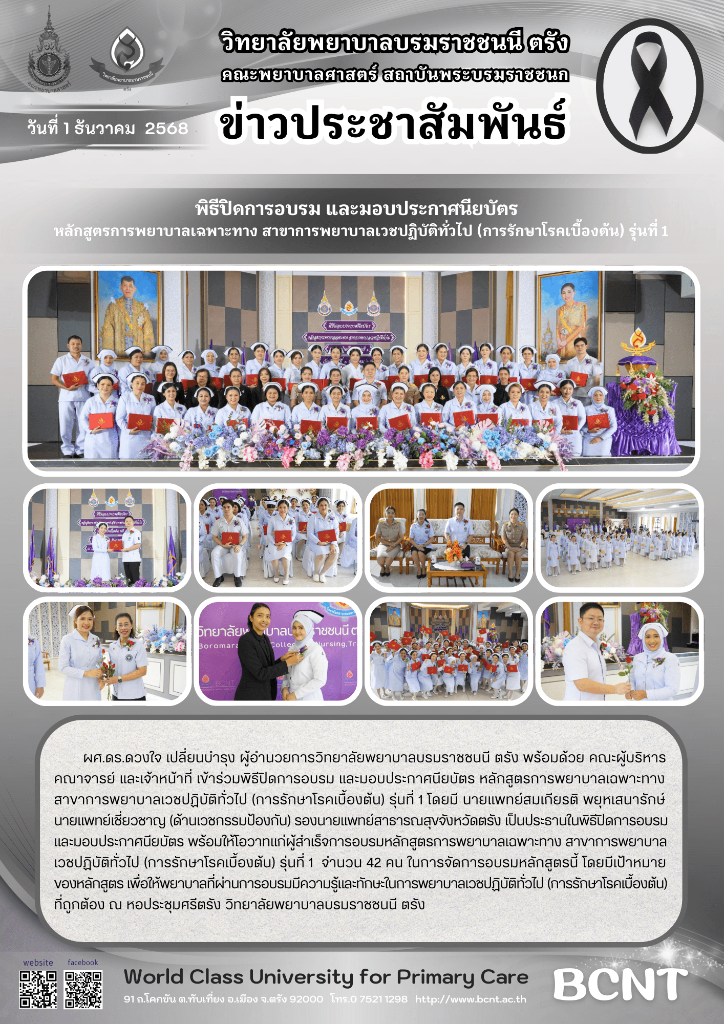 พิธีปิดการอบรม และมอบประกาศนียบัตร หลักสูตรการพยาบาลเฉพาะทาง สาขาการพยาบาลเวชปฏิบัติทั่วไป (การรักษาโรคเบื้องต้น) รุ่นที่ 1