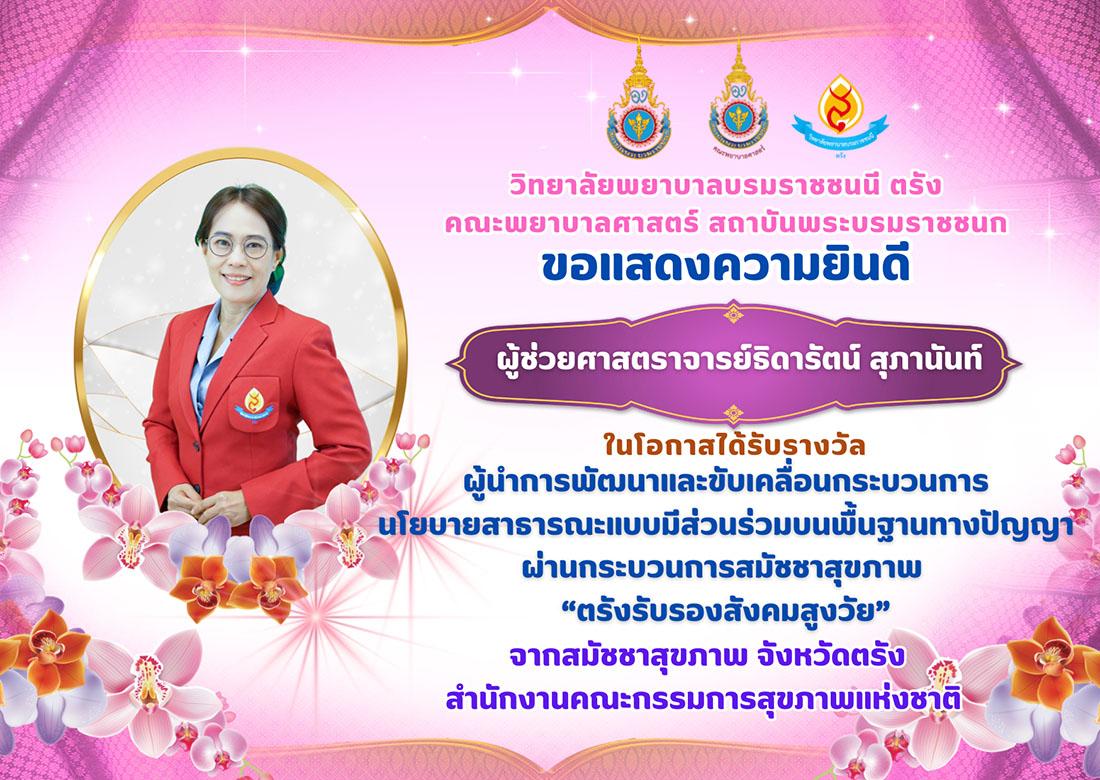ขอแสดงความยินดีกับ ผศ. ธิดารัตน์ สุภานันท์ กับรางวัลผู้นำการพัฒนาและขับเคลื่อนกระบวนการนโยบายสาธารณะแบบมีส่วนร่วมบนพื้นฐานทางปัญญาผ่านกระบวนการสมัชชาสุขภาพ “ตรังรับรองสังคมสูงวัย”