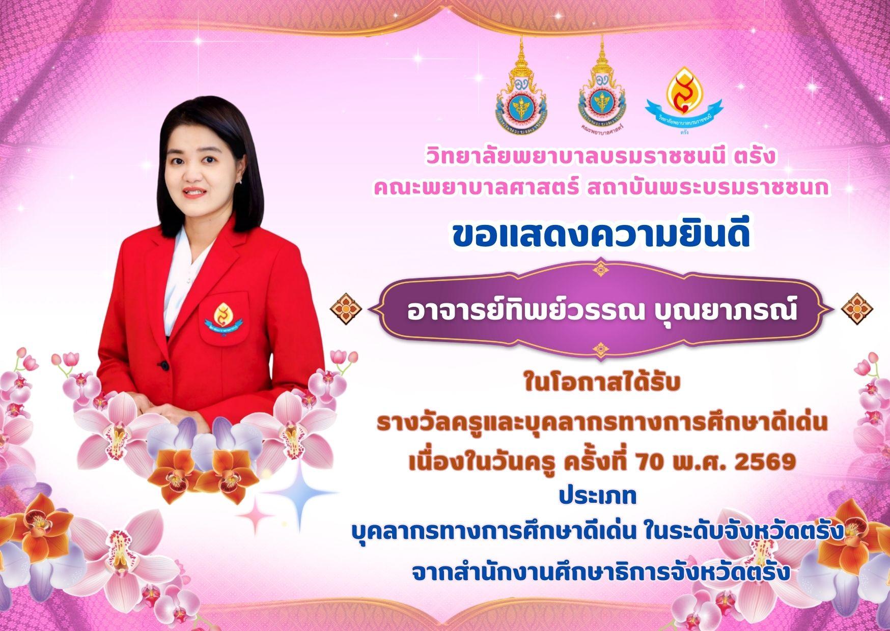 ขอแสดงความยินดีกับ อาจารย์ทิพย์วรรณ บุณยาภรณ์ เนื่องในโอกาสได้รับ รางวัลครูและบุคลากรทางการศึกษาดีเด่น เนื่องในวันครู ครั้งที่ 70 พ.ศ. 2569