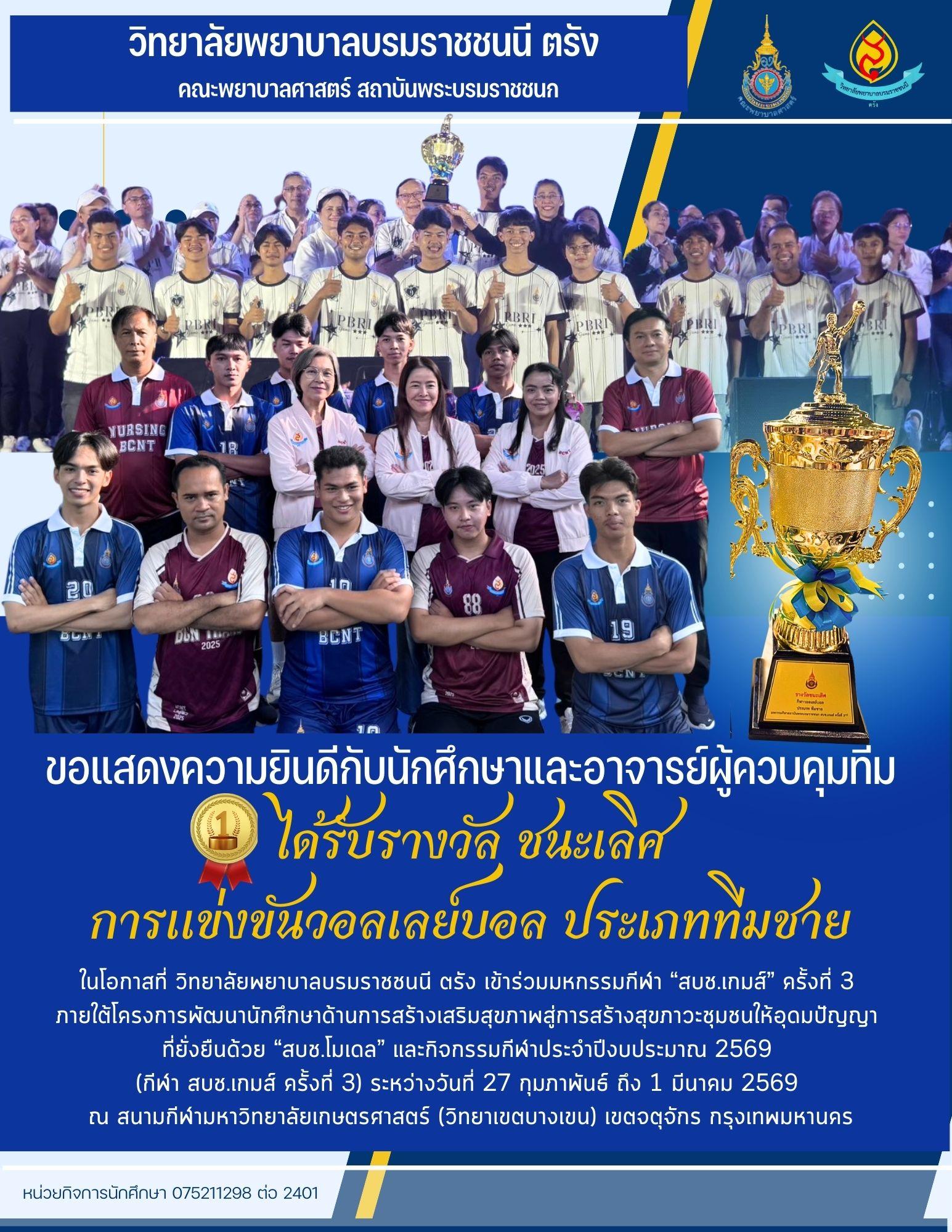 ขอแสดงความยินดีกับนักศึกษาและอาจารย์ผู้ควบคุมทีม ได้รางวัลชนะเลิศการแข่งขันวอลเลย์บอล ประเภททีมชาย