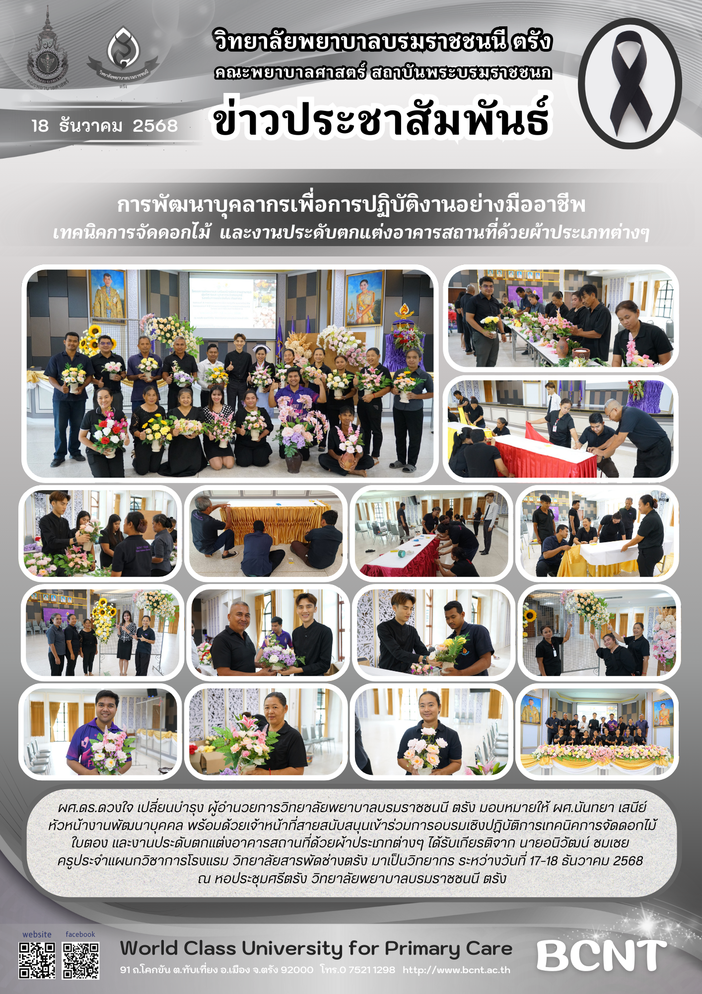 การพัฒนาบุคลากรเพื่อการปฏิบัติงานอย่างมืออาชีพเทคนิคการจัดดอกไม้ และงานประดับตกแต่งอาคารสถานที่ด้วยผ้าประเภทต่างๆ